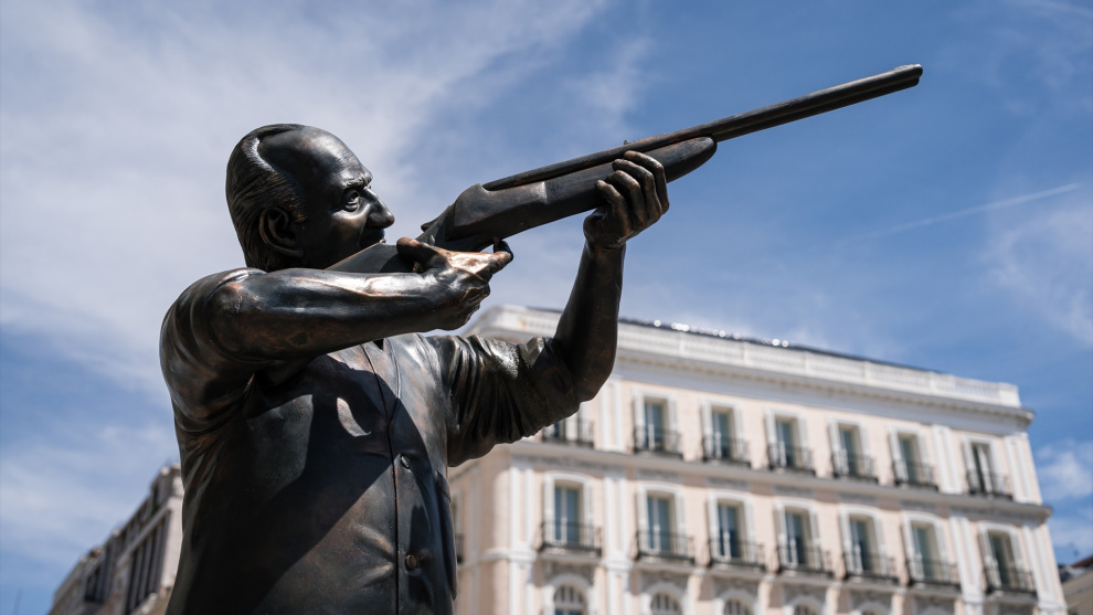 El pasado martes, confundido entre la marabunta de turistas y burlando las ordenanzas municipales, un artista chileno llamado Nicolás Miranda se adentró en el paisaje desértico de la Puerta del Sol y plantó una figura pedestre de Juan Carlos I. Era una escultura enana y poca cosa pero en las fotografías aparenta una estatura de coloso. El rey viejo, un rey de poliuretano metalizado, sostiene una escopeta con destreza de francotirador y pone en el punto de mira a otra estatua, la concurrida estatua de la osa y el madroño, que ya no ocupa una discreta bocacalle sino que se ha deslizado hacia el centro de la plaza.