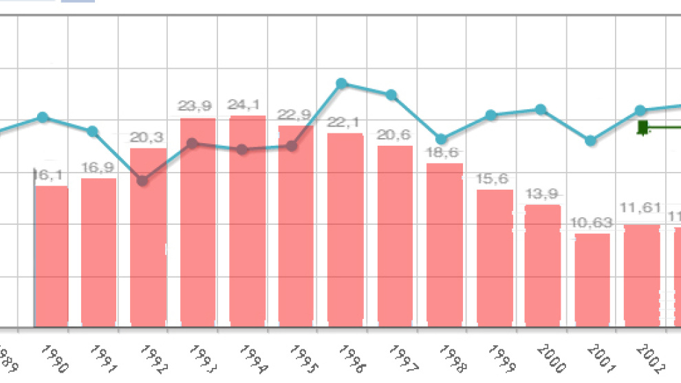 ¿Tienen relación variables como el desempleo (barras rojas en gráfico) sobre la evolución de los suicidios? Algunas publicaciones científicas, como The Lancet, afirman que sí, apoyándose para ello en los datos ofrecidos por la Organización Mundial de la Salud (OMS) que, precisamente, el año pasado advertía de cómo el suicidio es la segunda causa de muerte en el mundo en los jóvenes entre 15 y 29 años.