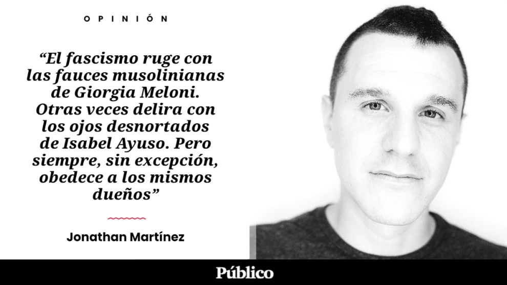 El fascismo, dice Walter Benjamin, trata de seducir a las masas empobrecidas pero sin modificar el régimen de producción y de propiedad. Les ofrece así un vehículo para que expresen su rabia pero no reclamen sus derechos. Es una política estética. Un dinosaurio de brillibrilli que duerme con placidez en tiempos de consenso pero que despierta enfurecido cuando le tiembla el suelo. Algunas veces ruge con las fauces musolinianas de Giorgia Meloni. Otras veces delira con los ojos desnortados de Isabel Ayuso. Pero siempre, sin excepción, obedece a los mismos dueños. Son el gobierno de los pocos. Son la ruina de los muchos.