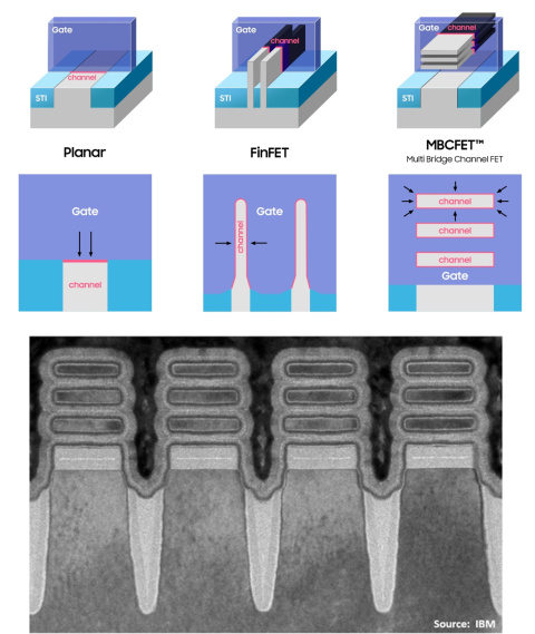 Arriba: ilustrando las diferencias entre MOSFET, FinFET y GAAFET. Abajo: imagen tomada al microscopio de un corte transversal de la puerta de un GAAFET. La anchura de cada apilado es del orden de 10 nm.
