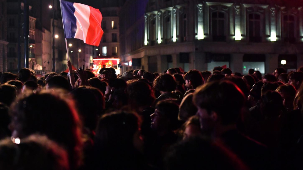 Una bandera francesa al viento sobre una manifestación antifascista convocada en París, Francia.- EFE/EPA/JULIEN MATTIA