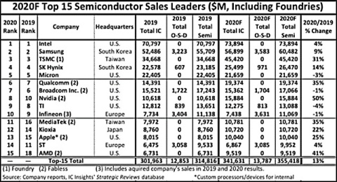 Los quince mayores fabricantes de CI del mundo, se localizan principalmente en EEUU y Extremo Oriente (con alguna representación de fabricantes europeos); en la Tabla muestro las ventas realizadas por esos fabricantes en 2020, la facturación total de los quince fue 301.963 millones de dólares USA, cantidad ligeramente inferior al PIB de Dinamarca. En el conjunto del sector, los “quince grandes” suponen cerca del 70% del total: