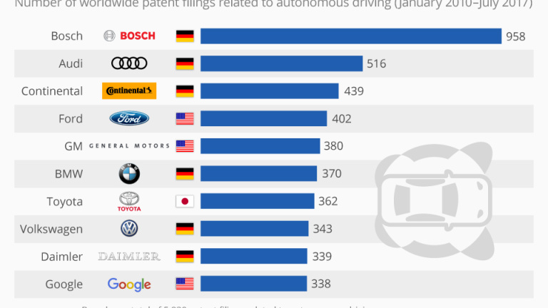 Los números hablan por sí solos: seis de las diez principales compañías por el número de patentes, son alemanas, es decir, cerca del 52%. La compañía Bosch se encuentra a la cabeza con 958 patentes, seguida de Audi (516) y Continental (439). Google, en cambio, cierra la lista de los 10 con 338 patentes registradas en 2010 y julio de 2017.