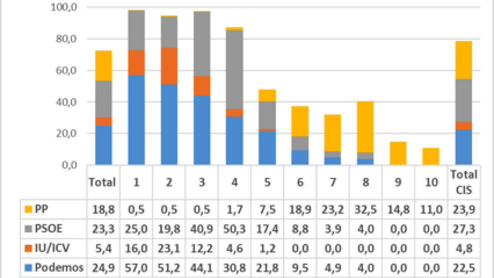 Por último, otro dato de interés es la situación objetiva de clase social. Según el estatus económico (con criterios convencionales de nivel de ingresos que usa el CIS) la media del censo estaría distribuida de la siguiente manera: clases trabajadoras, 67,4%; clases medias, 4,8%; clases altas o dominantes, 0,1%. No obstante, para el voto a Unidos Podemos la distribución es, respectivamente, 78,6%, 0,4% y 0%. Hay que advertir que en el primer caso no contestan el 27,8% y en el segundo el 17,9% y que, por otras referencias, podrían encajar mayoritariamente en las clases medias. La valoración, en todo caso, es que en el electorado de Unidos Podemos tienen mayor peso demográfico las clases trabajadoras y que las élites dominantes, económico-financieras e institucionales, se concentran en PP y PSOE.