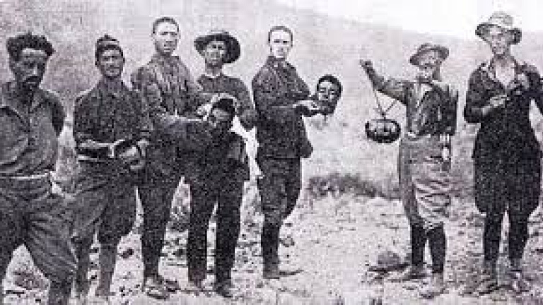 Soldados de la Legión extranjera sosteniendo cabezas de rifeños como objetos de trofeo. Foto publicada por Jacques Roger-Mathieu en 'Las memorias de Abd El Krim' (1926).