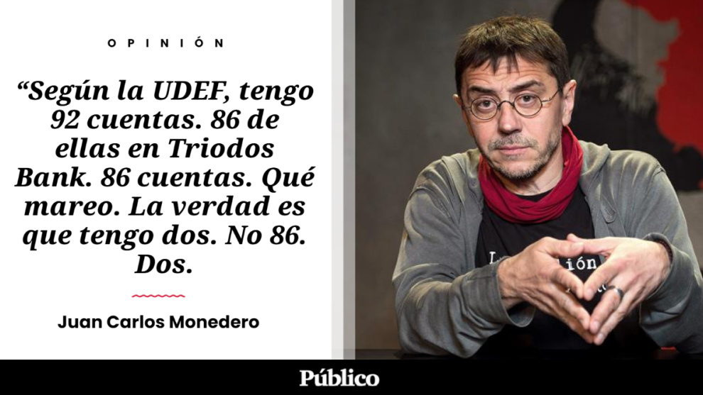 Según la UDEF, dice el auto del juez García Castellón, tengo 92 cuentas. 86 de ellas en Triodos Bank. Ochenta y seis cuentas. Qué mareo. La verdad es que tengo dos. No ochenta y seis. Dos. Una cuenta de ahorro y otra de crédito. Pero el auto (que ha llegado antes a los tabloides de extrema derecha que a mi mismo) brinda el titular a OK Diario: La UDEF revela a la Audiencia Nacional que el anticapitalista Monedero tiene ¡92 cuentas bancarias!. Ya está otra vez el circo montado. ¿No podía haberlo comprobado el juez García Castellón antes de imputarme? ¿O de lo que se trataba precisamente era de imputarme? Que Vox esté incluido en el procedimiento del juez García Castellón da más pistas. ¿Qué espera que hagamos la gente de Podemos mientras intenta cazarnos como animales acorralados?