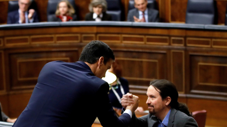 Pedro Sánchez (i) y Pablo Iglesias se dan la mano en el Congreso. EFE