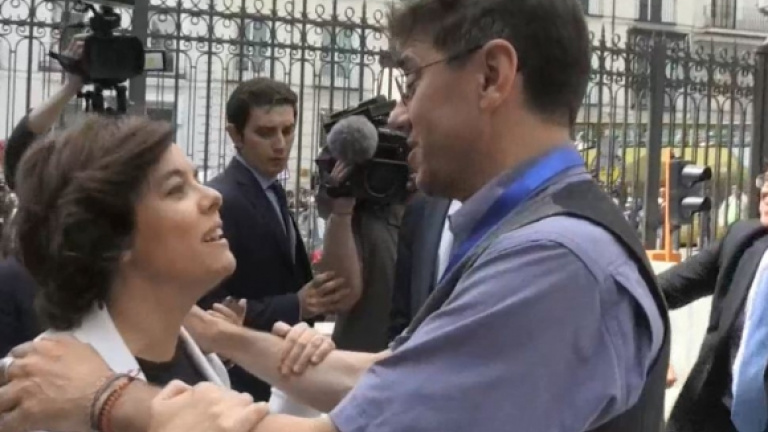 La queja con el gesto con la Vicepresidenta tiene dos ángulos. El primero es el que señala un posible gesto de "micromachismo". Es evidente que no estaba en mi voluntad y que hubiera hecho lo mismo si el que salía en ese momento hubiera sido Montoro o Rajoy (aunque a ellos no los conozco personalmente y a Sáenz de Santamaría sí). Mis disculpas han venido porque hay gente que cree que no es así y por eso no he tenido reparos en pedirlas. Pero no es verdad que hubiera la mínima violencia. Agarro por los hombros a Sáenz de Santamaría y ella pone su mano sobre mi brazo después de darnos un par de besos. Si hubiera habido la más mínima presión la Vicepresidenta me hubiera quitado los brazos como hizo la Princesa de Asturias con su abuela. No es persona Sáenz de Santamaría que tolere ninguna falta de respeto. Sin olvidar que estaba rodeada de guardaespaldas que me hubieran roto un brazo de identificar la mínima violencia. No es cierto y es honrado reconocer que no hubo ningún ejercicio de fuerza. La composición, que reconozco que no es amable, no se debe a que la Vicepresidenta sea débil, sino a que, aunque yo no haya sido agraciado por una estatura notable, es evidente la diferencia. ¿Pero de verdad que la débil es la Vicepresidenta?