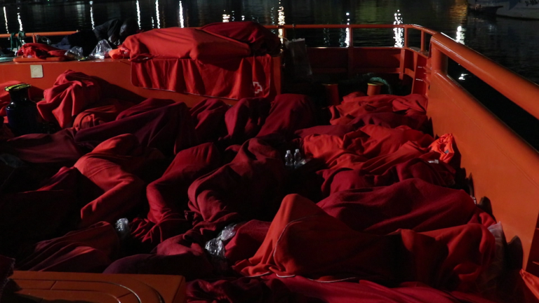 26 de octubre, 2:36. La Guardia Civil abandona el lugar. Cruz Roja atiende a los migrantes a bordo del barco. Les dan ropa y comida. Aún así, siguen hacinados, en el suelo, con parte de su ropa mojada y con muchas horas de mar a las espaldas. Algunos bajan a los cuartos de baño, su primer contacto con suelo europeo. Resulta difícil de creer que, después de casi 30 años desde el primer naufragio de una patera en el Mediterráneo, todavía estas personas que se juegan la vida no tengan un trato y una acogida digna cuando pisan territorio español.
