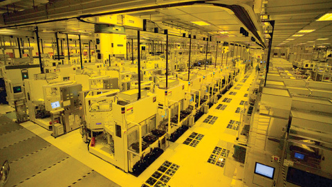 Vista panorámica de una enorme sala limpia de fabricación de circuitos integrados de TSMC, una de las mayores empresas del sector