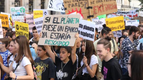 “El clima no puede esperar”; “Si el planeta fuera un banco ya lo habrían salvado"; “La avaricia enferma y mata”; “Cambia tu vida, no tu clima”; “Hay más plásticos que sentido común”; “La Tierra grita, tenemos que escuchar”; “Devorando la Tierra, reventamos”… Lemas como estos fueron paseados este viernes por jóvenes, y también por niños y niñas, por las calles de todo el mundo. El ambiente de la manifestación en Madrid, de Atocha a Sol fue espectacular, hasta con un espacio llamado “Baby Bock”, zona acotada poco después de la cabecera, para familias con niños, incluidos carritos de bebé. La temperatura decidió ponerse también a favor de la asistencia y el resultado fue alentador.