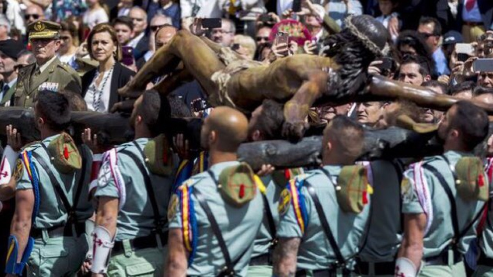 Cuatro ministros (Cospedal, Zoido, Catalá y Méndez de Vigo) dando voces con el himno legionario celebrando la muerte. La muerte de otros, claro. Los que cantan a la muerte podrían ser una célula suicida que quedasen para quitarse la vida, pero no. La legión extranjera fue un adelanto de los mercenarios que cobraban por matar haciendo pocas preguntas. Estos rudos personajes, que como bien dicen los colegas de Mongolia parecen sacados de un videoclip de Village People, no agreden solamene con su estética kitsch, sino que son una invitación constante a regodearnos con el desprecio a la vida. ¡Viva la muerte! ¡Abajo la inteligencia! Eso gritaba Millán Astray al Rector Miguel de Unamuno en Salamanca. Cifuentes, dicen en documentos no sellados, le gritó al Rector plagiario de la Universidad Rey Juan Carlos, Fernando Suárez: ¡Viva el notable por la cara! ¡Abajo la inteligencia! Y en el último beso que le enviaba/ su postrer despedida le consagraba:/Por ir a tu lado a verte/ mi más leal compañera/ me hice novio de la muerte/ la estreché con lazo fuerte/ y su amor fue mi Bandera.