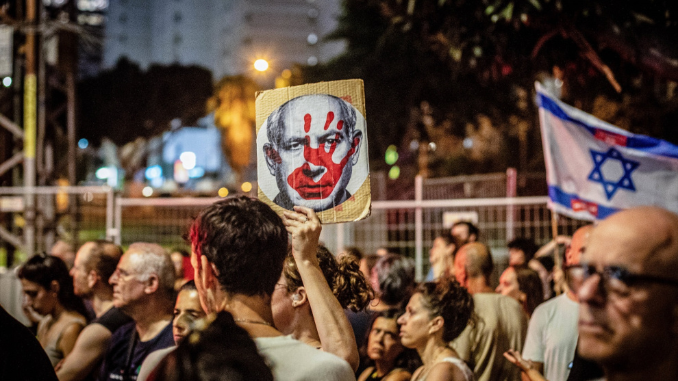 Un manifestante israelí sostiene un cartel que muestra el rostro del Primer Ministro israelí Benjamín Netanyahu con la palma ensangrentada. Foto: Eyal Warshavsky/SOPA Imágenes vía ZUMA Press Wire/dpa
