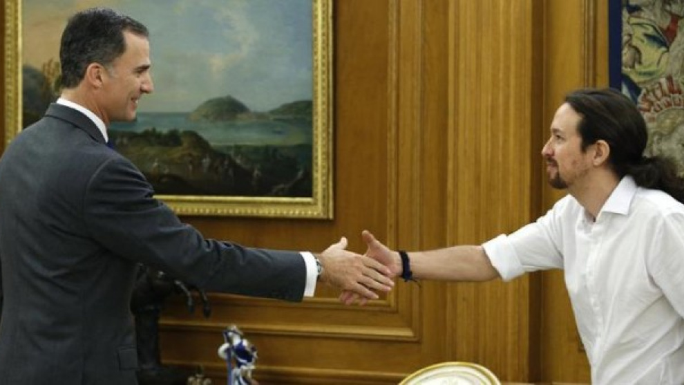 El rey Felipe VI recibe al líder de Podemos, Pablo Iglesias, durante la ronda de consultas. /EFE
