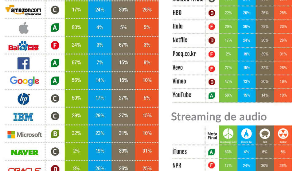 Y mientras uno se queda ojiplático con este tipo de afirmaciones, podemos seguir apoyándonos en documentos de Greenpeace para saber cómo nosotros mismos contribuimos al incremento de la contaminación. En su reciente informe “Clicking Clean: ¿Quién gana la carrera para crear un Internet verde? 2017”, la organización ecologista revela cuánto contaminan algunas de las compañías tecnológicas cuyos servicios consumimos masivamente.