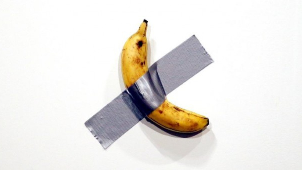En el arte contemporáneo el hiperrealismo cada vez está mejor visto. Bebés gigantescos, vasos de agua por la mitad, bolas de papel arrugado y ahora, atención, un plátano. Tal vez lo primero sería ir pensando en cambiar la denominación de“contemporáneo”, un término que empieza a ponerse rancio, especialmente cuando uno contempla a esos artistas cuya originalidad consiste en seguir chupando rueda de Duchamp después de un siglo. A un tío se le ocurre pegar un plátano de una pared con un trozo de cinta adhesiva y resulta que es un genio, operación estética que culmina en el momento de su venta por 120.000 dólares, cantidad que excede notoriamente el valor del plátano y que además hay que multiplicar por tres, ya que se vendieron tres ediciones de la obra, o sea, tres plátanos.