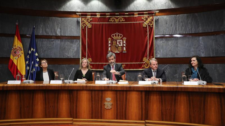 Concepción Sáenz Rodríguez Vocal; Clara Martínez Careaga Vocal; Carlos Lesmes, presidente del Consejo General del Poder Judicial; Gerardo Martínez Tristán, Vocal; y Nuria Diaz Abad Vocal,(i-d), durante la presentación de una guía sobre el proceso