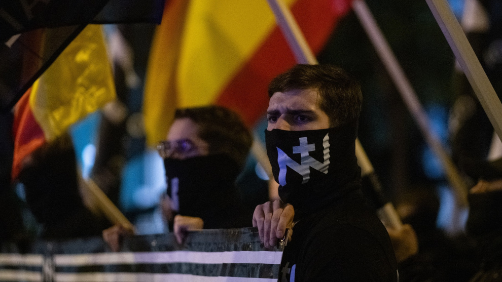 Un joven con el rostro cubierto en la marcha convocada por el grupo ultra Núcleo Nacional.Fernando Sánchez / Europa Press