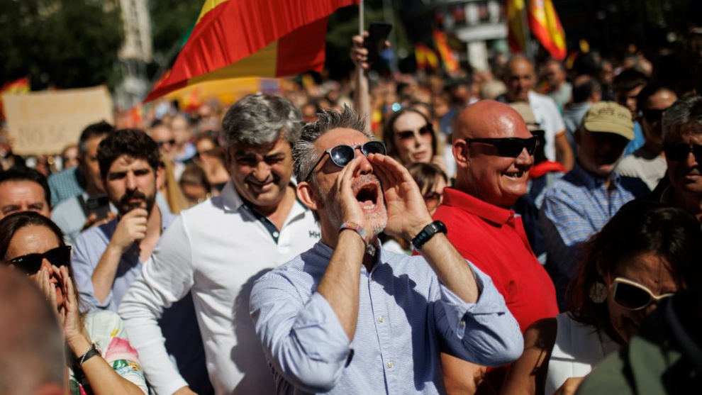 Un gracioso -o quizá otro partidario de Ayuso- repartió carteles con el apellido de Feijóo mal escrito: le faltaba una O, pero nadie entre los manifestantes que lo llevaban muy ufanos parecía notar la omisión y, si la notaban, tampoco es que les importara mucho. Difícilmente iba a molestarles la errata en un acto contra quienes supuestamente pretenden saltarse la Constitución a la torera, promovido por los mismos que llevan cinco años bloqueando la renovación del poder judicial mientras se pasan el mandato constitucional por el forro. Es gente que sale a la calle únicamente cuando España se va a romper, que lleva rompiéndose la tira de años y luego ni siquiera se agrieta. El patriotismo, decía Samuel Johnson, es el último refugio de los canallas, aunque se ve que en España es el primero y casi el único.