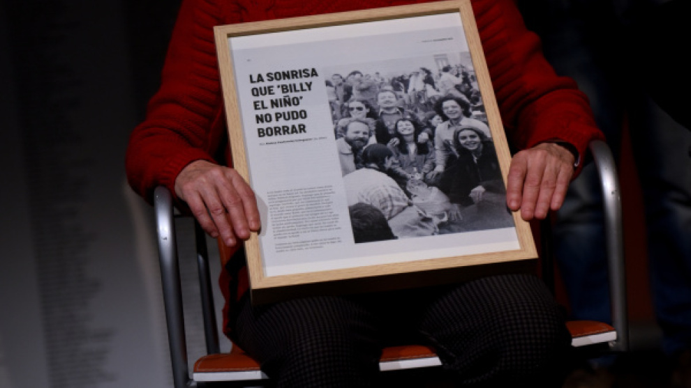 Felisa Echegoyen, víctima de torturas, sujeta el artículo que relata su historia. Acto “Supervivientes de la memoria” realizado por el periódico Público en diciembre de 2019.Fernando Sánchez
