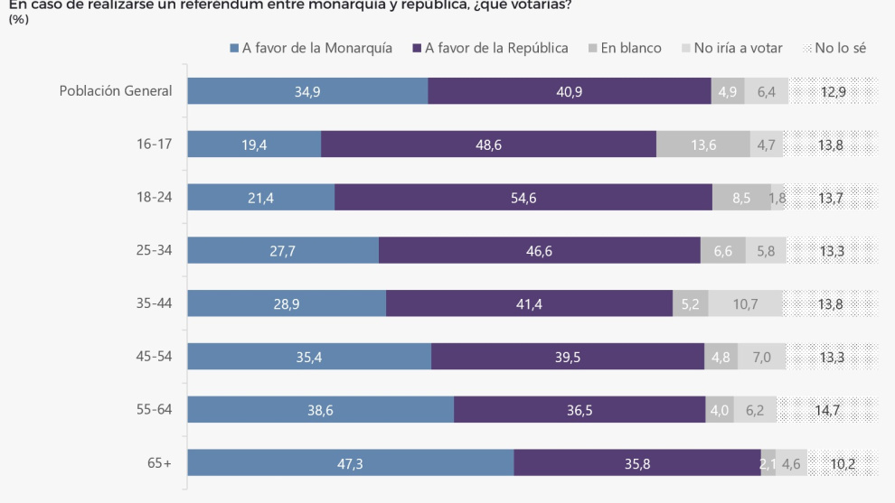 Los ciudadanos que no pudieron votar la Constitución de 1978 son quienes se decantan más claramente por una república: aquellos entre 16 y 54 años. En general, el 40,9% de los españoles votaría esta opción. Pero solo se encuentran porcentajes superiores a esta media entre los más jóvenes: la república sería la elección para el 48,6% de quienes tienen entre 16 y 17 años, el 54,6% de los de 18 a 24 años, el 46,6% de los de 25 a 34 años y el 41,4% de los de 34 a 44 años; entre los de 45 a 54 años, el porcentaje bajaría al 39,5%, aunque la opción de la república seguiría siendo la más votada.