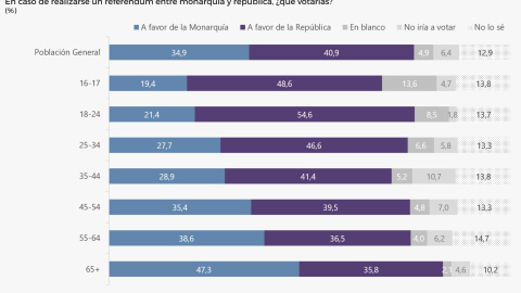 Solo los mayores de 55 años y, sobre todo, los de más de 65 años, prefieren monarquía, aunque en ninguno de los dos casos esta opción representa más del 50%: 47,3% para los últimos y 38,6% para la franja de 55 a 64 años.