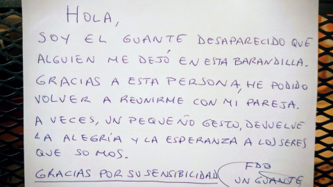 A la mañana siguiente – bien temprano para no llegar tarde al trabajo –, cuando desciendo esa misma escalera, en el lugar exacto donde reposaba el guante, encuentro esta nota manuscrita, de hermosa caligrafía. Con sus tildes y sus comas: