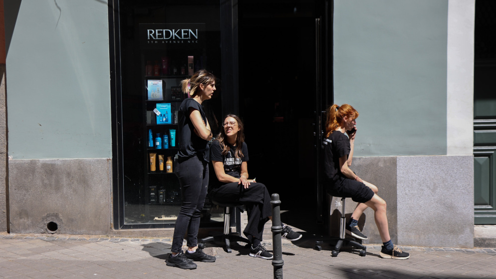 Empleadas de una peluquería conversan y toman el sol en la puerta del establecimiento durante el apagón.Jaime Morato