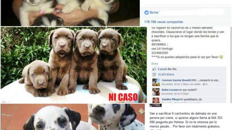 Las alertas falsas sobre perros de distintas razas que van a ser sacrificados de manera inminente surgen cada cierto tiempo desde hace años, especialmente en Facebook. Junto a una conmovedora foto cualquiera, robada en redes sociales o sacada del buscador de Google, un texto alarmante anima a adoptar rápidamente huskies, labradores, dálmatas y demás perros de raza, nunca chuchos, para evitar su muerte segura.