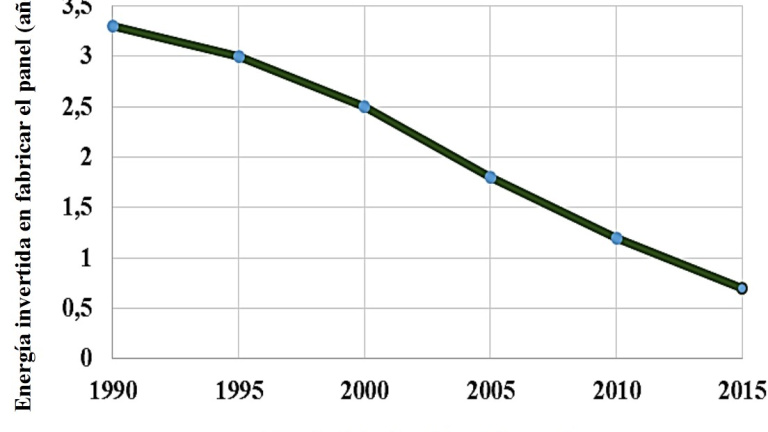 Tiempo de amortización energética o energía invertida en la fabricación e instalación de un panel fotovoltaico en función del año de fabricación. Elaboración propia a partir de los datos del Photovoltaics Report 2015 (Instituto Fraunhofer)