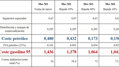El análisis de la tabla muestra que la reducción del precio del petróleo desde el mes inicial, M1, hasta el final, M4, es de un 67,5%. Sin embargo, en ese mismo período de tiempo. el precio de la gasolina 95 se redujo en un 27,4% Además, cuanto menor es el precio del crudo, más importante es el porcentaje que tienen, sobre el coste total, los costes indirectos (impuestos, distribución y margen comercial), dato que recoge la última fila de la tabla, moviéndose desde un 56 % en el mes M1 hasta suponer el 73,8 % en el mes M4.