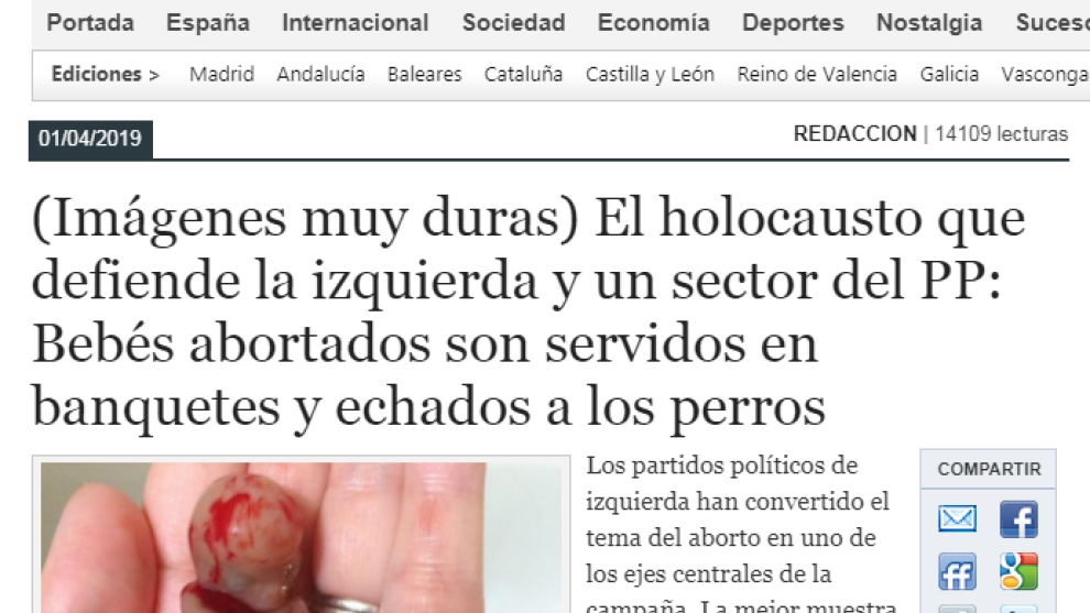 La 'noticia' en realidad no trata de nada de eso. Es una arenga antiabortista con fotos de dudosa procedencia y un titular engañoso, que se va radicalizando a medida que avanza el relato y que incluye frases como esta: "El PSOE legalizó el asesinato y el Partido Popular de Rajoy fue cómplice".