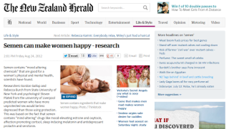 Desde entonces, hay quienes han publicado el asunto calcado tal cual de sus orígenes y quienes han enriquecido la noticia con nuevas e inusitadas teorías, desde que tragar semen cura el cáncer hasta que combate la depresión o directamente que hace más feliz. Siempre que seas mujer, claro. De los posibles beneficios (o consecuencias) de la ingesta de semen por parte de los hombres no dice nada el supuesto estudio.