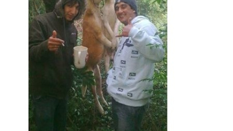 Tras rastrear la imagen en Internet, comprobé que esta foto se publicó en 2011 en varios medios de Argentina, donde causó conmoción, y corresponde a dos individuos que acabaron siendo encarcelados por torturar y matar a esos perros. Nada que ver con el asunto de los galgos de España.