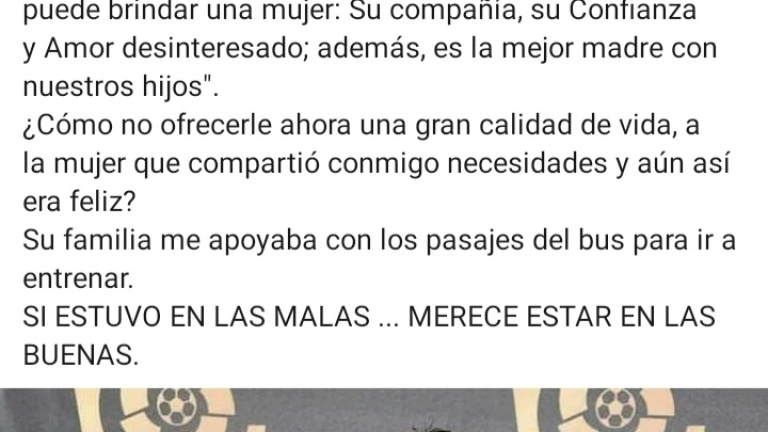 "Porque mi Esposa Fue la única mujer que me quiso cuando yo vendía pescado, fue la única que cuando yo no era nadie en el fútbol me brindó lo más lindo que me puede brindar una mujer: Su compañía, su Confianza y Amor desinteresado; además, es la mejor madre con nuestros hijos". ¿Cómo no ofrecerle ahora una gran calidad de vida, a la mujer que compartió conmigo necesidades y aún así era feliz? Su familia me apoyaba con los pasajes del bus para ir a entrenar. SI ESTUVO EN LAS MALAS ... MERECE ESTAR EN LAS BUENAS".