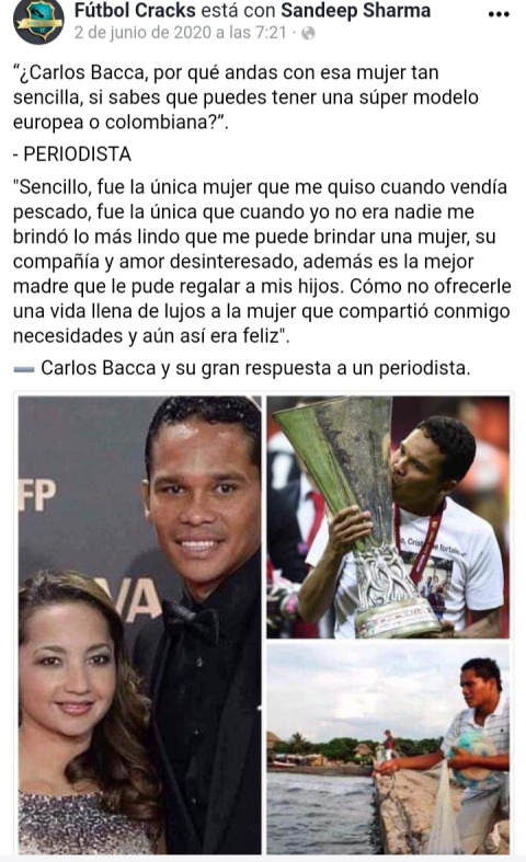 Carlos quiere a Shayira desde siempre y no lo oculta. Y viceversa. De ahí a todo lo que han puesto en su boca para ofrecer moralejas, van mundos. Es de mal gusto hasta tocar lo repugnante ver excepcional que un futbolista no haya cambiado a su pequeña pareja por una súper modelo una vez alcanzado el éxito. Bacca se casó con la mujer de su vida y eso responde a la pregunta: "¿por qué tu esposa, no es una súper modelo, así como la de muchos futbolistas?".