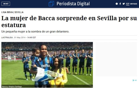 De hecho, durante la estancia de Bacca en el Sevilla, Periodista Digital publicó, en mayo de 2014, una 'noticia' al respecto: "La mujer de Bacca sorprende en Sevilla por su estatura", "Una pequeña mujer a la sombra de un gran delantero". Con un escueto texto: