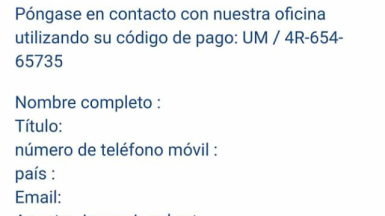 "Póngase en contacto con nuestra oficina utilizando su código de pago: UM / 4R-654-65735".