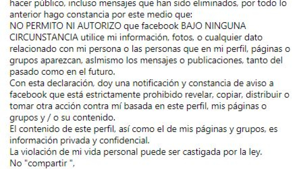 "El contenido de este perfil, así como el de mis páginas y grupos, es información privada y confidencial", continúa el relato, que añade que "la violación de mi vida personal puede ser castigada por la ley" y 'aclara' que lo que debes hacer para remediar "ser vulnerado" es "copiar y pegar" el texto, en lugar de "compartir".