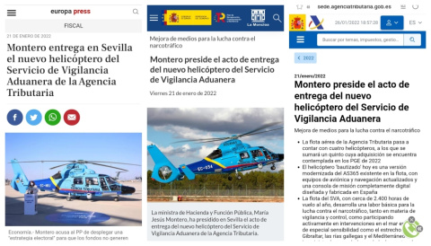 En la mañana del 21 de enero, la ministra de Hacienda y Función Pública, María Jesús Montero, presidió en Sevilla el acto de entrega del nuevo helicóptero del Servicio de Vigilancia Aduanera de la Agencia Tributaria, "una versión modernizada del AS365 ya existente en la flota de Aduanas, con equipación actualizada y un sistema digital de misión diseñado y fabricado en España". Montero dijo del aparato que "es un ejemplo claro que habla muy bien del liderazgo de nuestro país en un sector tan competitivo y especializado".