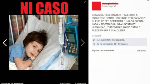 En cualquier caso, es un hoax de muy mal gusto. Pero desmontar este bulo de una niña enferma de cáncer es muy simple: ¿Esto de cuándo es?, ¿cómo se llama la niña?, ¿en qué hospital está?, ¿de qué país?, ¿a qué número llamo para regalarle un millón de euros?..