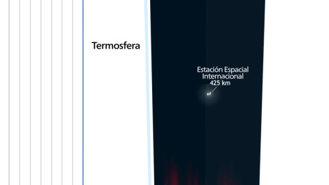 En realidad, no, no hemos abandonado la atmósfera terrestre. Lo que hemos abandonado es la parte más densa de la sopa de nitrógeno y oxígeno que nos vio nacer. Más o menos, lo que viene siendo la troposfera (donde residimos habitualmente), la estratosfera (adonde a veces llegamos en avión), la mesosfera y un pelín de la termosfera. Pero las atmósferas planetarias siguen considerándose tales mientras haya moléculas fijadas por la gravedad del planeta (o luna) en cuestión; en el caso de la Tierra, eso se extiende hasta el final de la exosfera, a unos 10.000 kilómetros de la superficie.