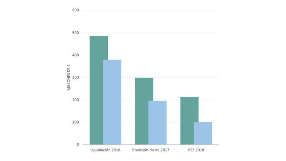 A partir de ahí propusimos un presupuesto que, con una interpretación no restrictiva de dicha regla, permitía impulsar inversiones y cambios en políticas sociales y culturales que respondían a las necesidades de nuestros conciudadanos. Algunas de estas inversiones ya se han realizado, otras tenían los proyectos preparados para su implementación inmediata cuando la regla de gasto se ha transformado en una artillería letal. No se nos permite realizar las inversiones financieramente sostenibles, que son las que se financian con remanentes de tesorería del año anterior y, al tiempo, se nos obliga a presentar un PEF por el que volvemos a las políticas austericidas de los años anteriores. Si nos atenemos a las cifras que en él se manejan en 2018 estaríamos por debajo de las cifras ejecutadas en 2016, nuestro primer año de gobierno, como se puede ver en el gráfico. La conclusión es clara: hay recortes y muchos, lo que no sabemos todavía es a qué inversiones concretas o a qué partidas van a afectar.