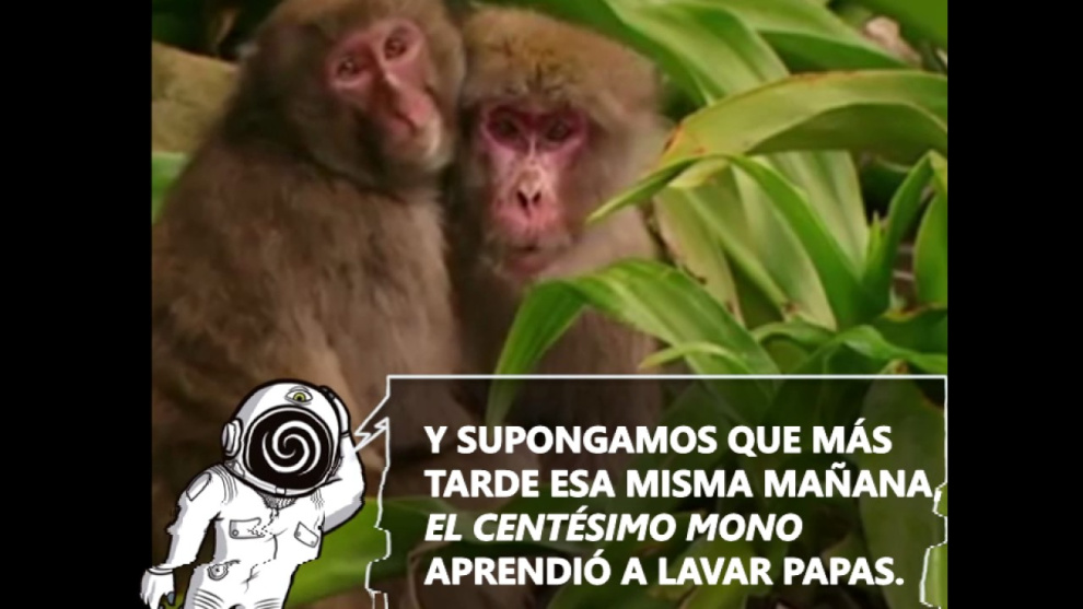 Es decir, cuando se alcanza un número crítico de iniciados, no se sabe por qué, un comportamiento aprendido se propaga casi de manera instantánea, en este caso de un grupo de monos hasta los demás monos del mundo.