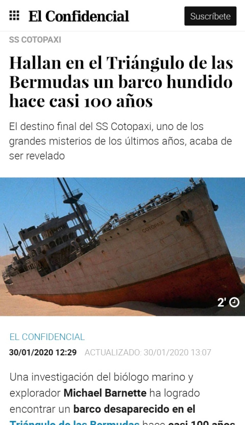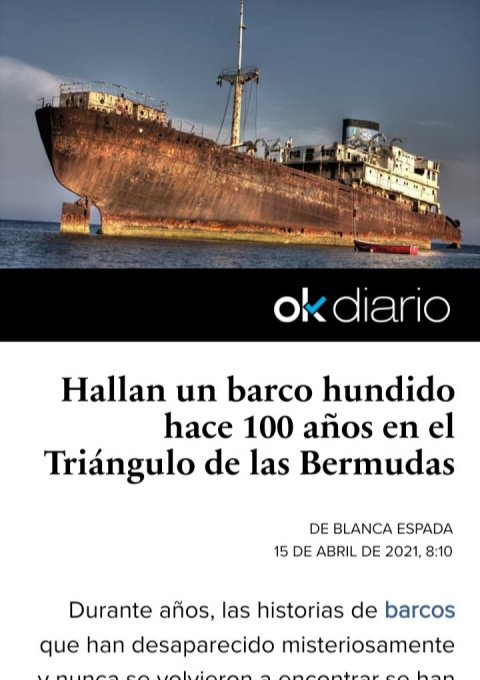 "Hallan un barco hundido hace 100 años en el Triángulo de las Bermudas". "El SS Cotopaxi fue un barco que desapareció en el Triángulo de las Bermudas hace casi 100 años pero cuyos restos por fin se han hallado".