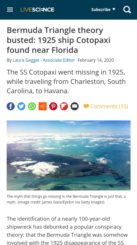 Las redes sociales de OkDiario han difundido ampliamente una noticia, publicada por ese periódico el 15 de abril en su sección "Curiosidades y Noticias Increíbles", que anuncia el descubrimiento de "un barco hundido hace 100 años en el Triángulo de las Bermudas", el "SS Cotopaxi". Dicen que sus "restos por fin se han hallado".