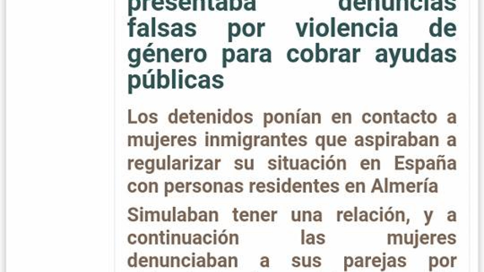 "Los detenidos ponían en contacto a mujeres inmigrantes que aspiraban a regularizar su situación en España con personas residentes en Almería. Simulaban tener una relación, y a continuación las mujeres denunciaban a sus parejas por violencia de género, obteniendo así la regularización e iniciando la tramitación de una subvención de 400 euros. Se ha detenido a 18 personas como presuntas autoras de los delitos de denuncia falsa y simulación de delito, amenazas, coacciones, falsedad documental y pertenencia a organización criminal".