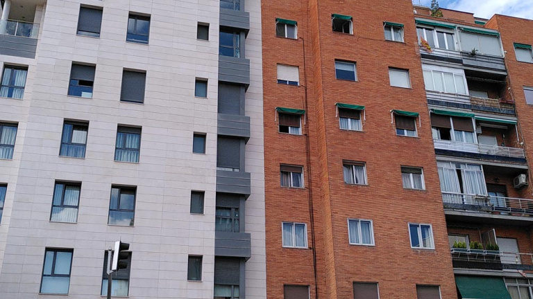 A la derecha, clásica fachada de ladrillo vista, sin aislamiento exterior. A la izquierda, una fachada con aislamiento exterior.