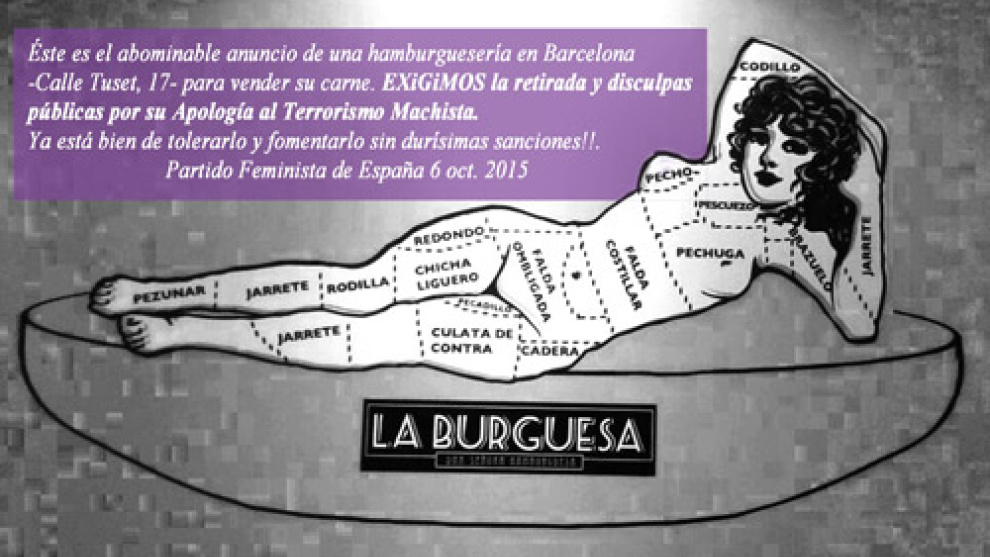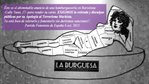 En una hamburguesería de Barcelona (calle Tuset nº 17) —y le hago la propaganda para que vayan a verlo y disfrutarlo todos aquellos caníbales a los que les satisfaga ver el anuncio— hay colgado un cartel con la reproducción de la Maja desnuda de Goya. En su cuerpo se han señalado los trozos de carne que una vez descuartizada podrían comerse, como si de una vaca se tratara. Acompaño la imagen con el cartel que hemos realizado en el Partido Feminista.