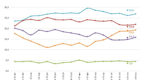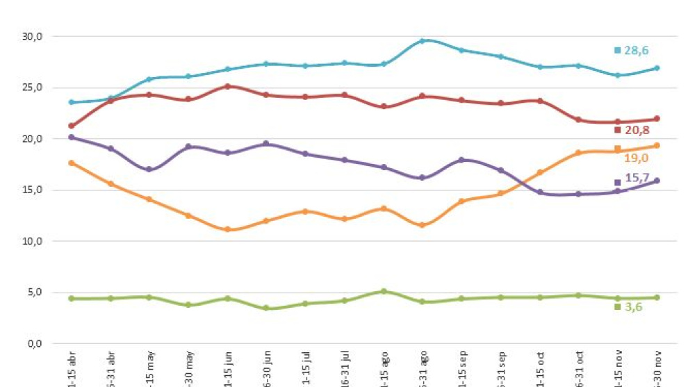 De hecho, si se comparan los pronósticos del CIS respecto de la media de las encuestas, cuyos datos se recogieron en el mismo periodo (la primera quincena de noviembre), se observa que otorga al PP 2,4 puntos más que la media (28,6% frente a 26,2%). Se trata de una desviación mucho mayor que en el caso de los otros cuatro partidos seguidos en el estudio, todos ellos con diferencias de menos del 1 %.